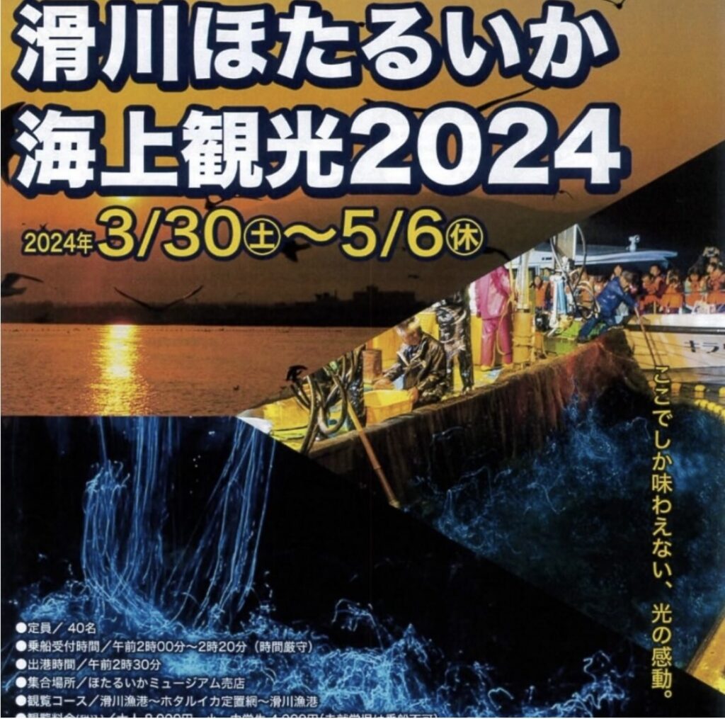 滑川ほたるいか海上観光2024 2024/01/17 Namerikawa Granvilla Grappaよりお得な宿泊プランを開始します。 2024年3月30日~5月6日に開催される、滑川ほたるいか海上観光付の乗船体験を 宿泊とセットでお楽しみいただける特別プラン!! 最大8,000円OFFで実質無料で乗船できます。 詳しくはGrappaご予約サイトをご覧ください。※天候や海上状況により欠航する場合がございます 【予約受付期間】 2024年1月17日(水)9時~2月7日(水)17時