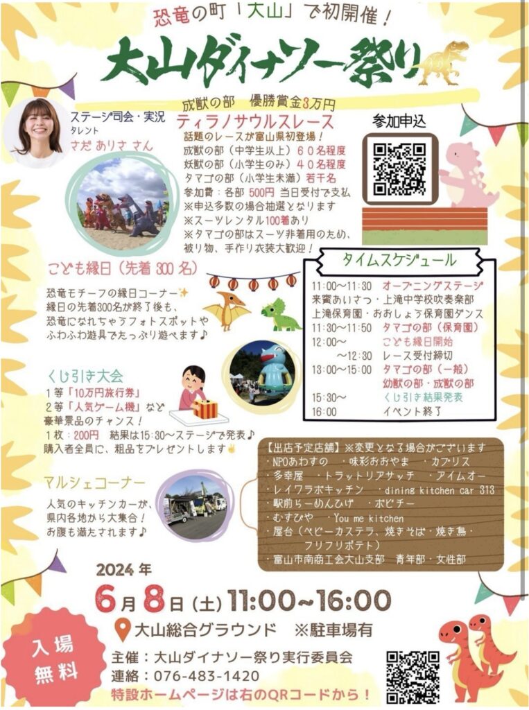 大山ダイナソー祭り出店決定 2024/05/152024/05/15 6月8日(土) 11:00~16:00 大山総合グラウンド 陣ya・キッチンカー・夢仁marumiの3ブースで出店いたします。 詳細については各店舗のインスタをご確認ください。 Screenshot